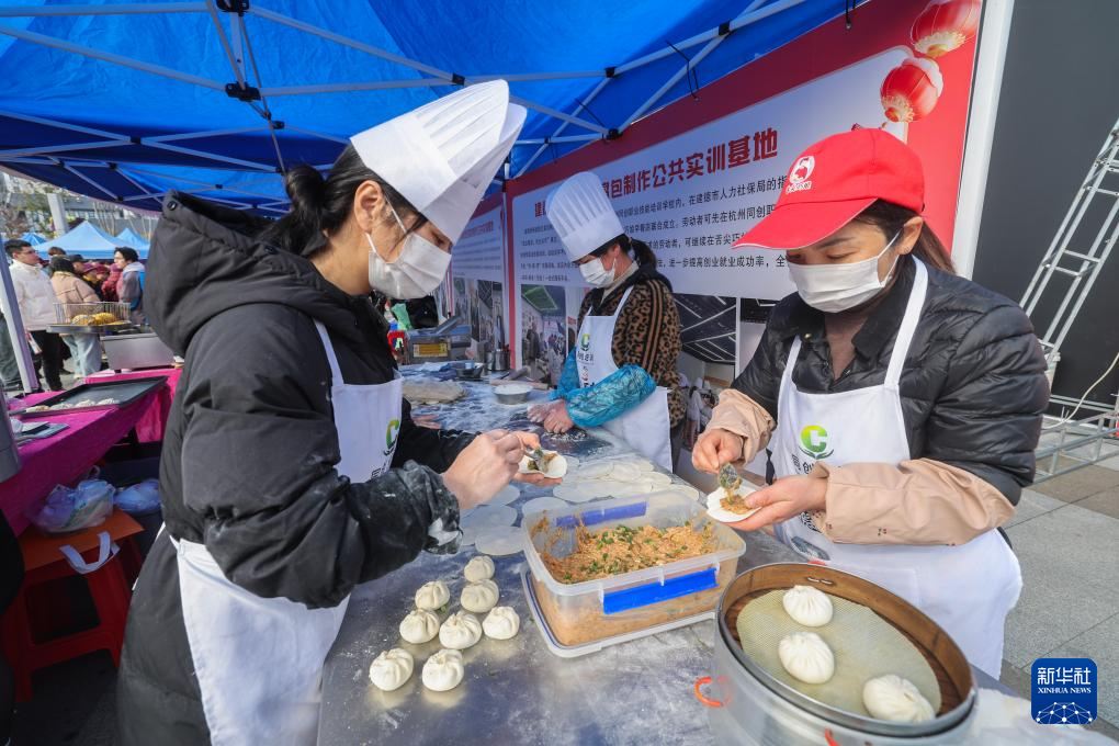 2月6日,在招聘会的建德市公共实训基地片区,工作人员在现场展示建德豆腐包的制作,应聘者可以现场报名参加实训基地培训,学习各类特色技能。