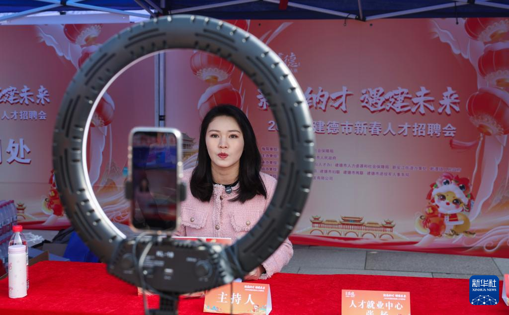 2月6日,主播在建德新春招聘会现场直播介绍各家企业的求职要求。