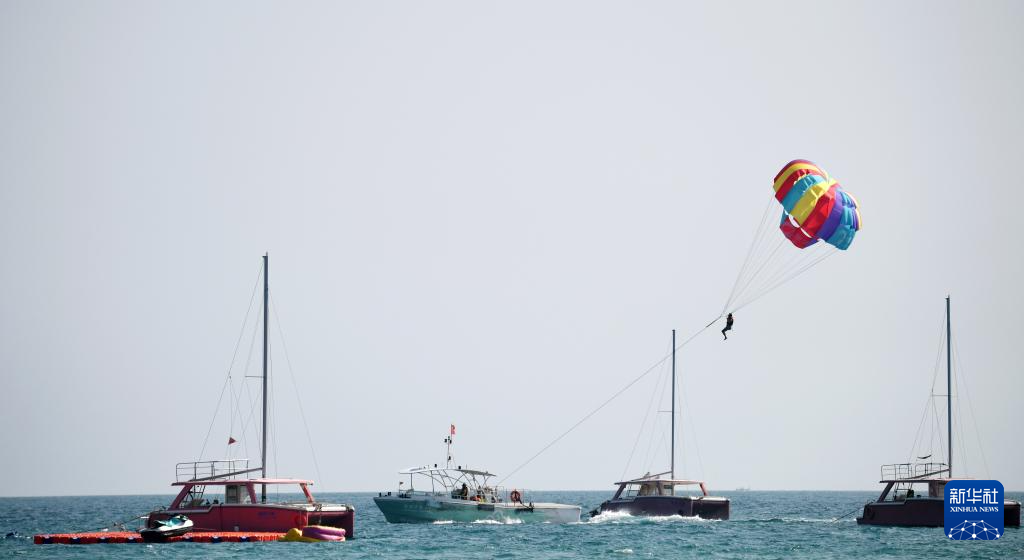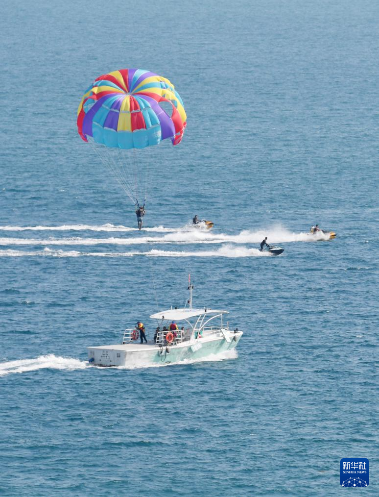 2月6日,游客在三亚市大东海景区体验海上项目。