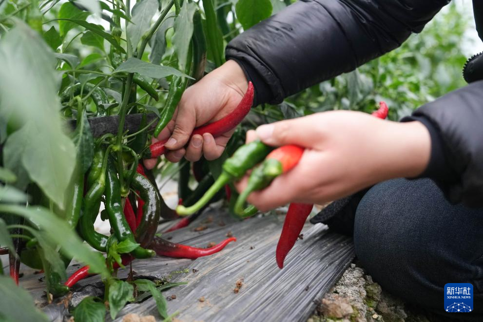 2月6日,贺小贞在湖南省宁乡市肖胜蓝家庭农场采摘辣椒。