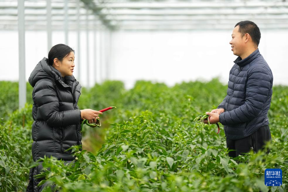 2月6日,肖胜蓝(右)、贺小贞在宁乡市肖胜蓝家庭农场讨论大面积种植一个新辣椒品种的可行性。