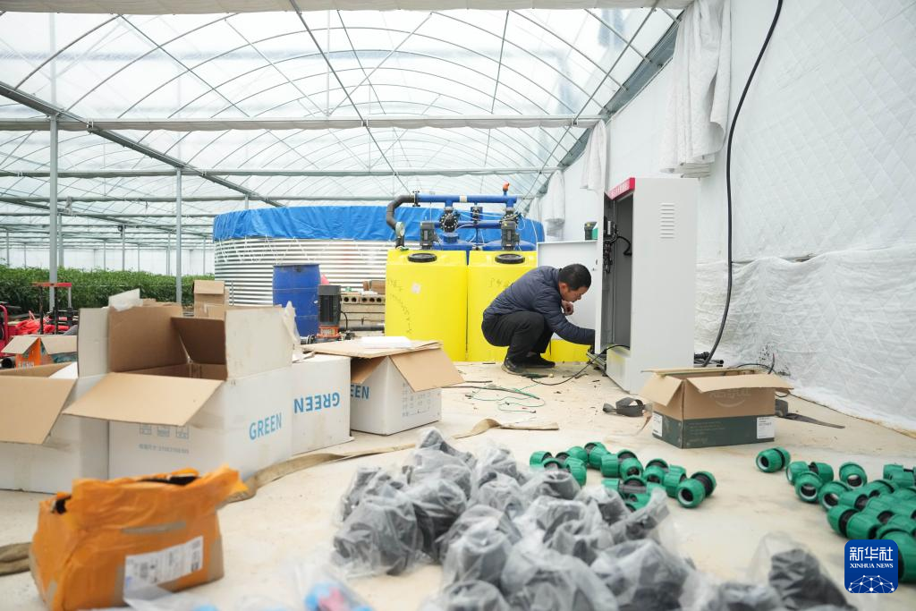 2月6日,肖胜蓝在宁乡市肖胜蓝家庭农场的温室大棚内组装水肥一体化灌溉设备。