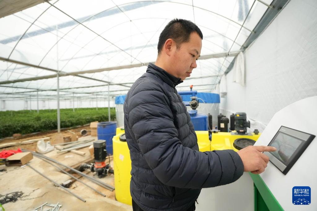 2月6日,肖胜蓝在宁乡市肖胜蓝家庭农场的温室大棚内调试水肥一体化灌溉设备。