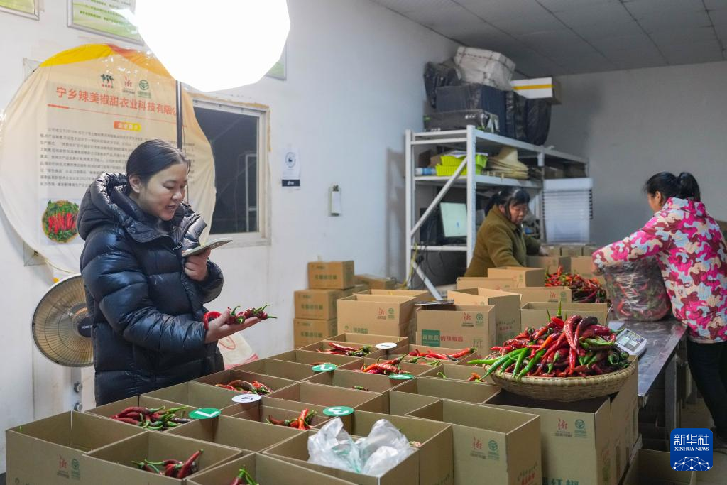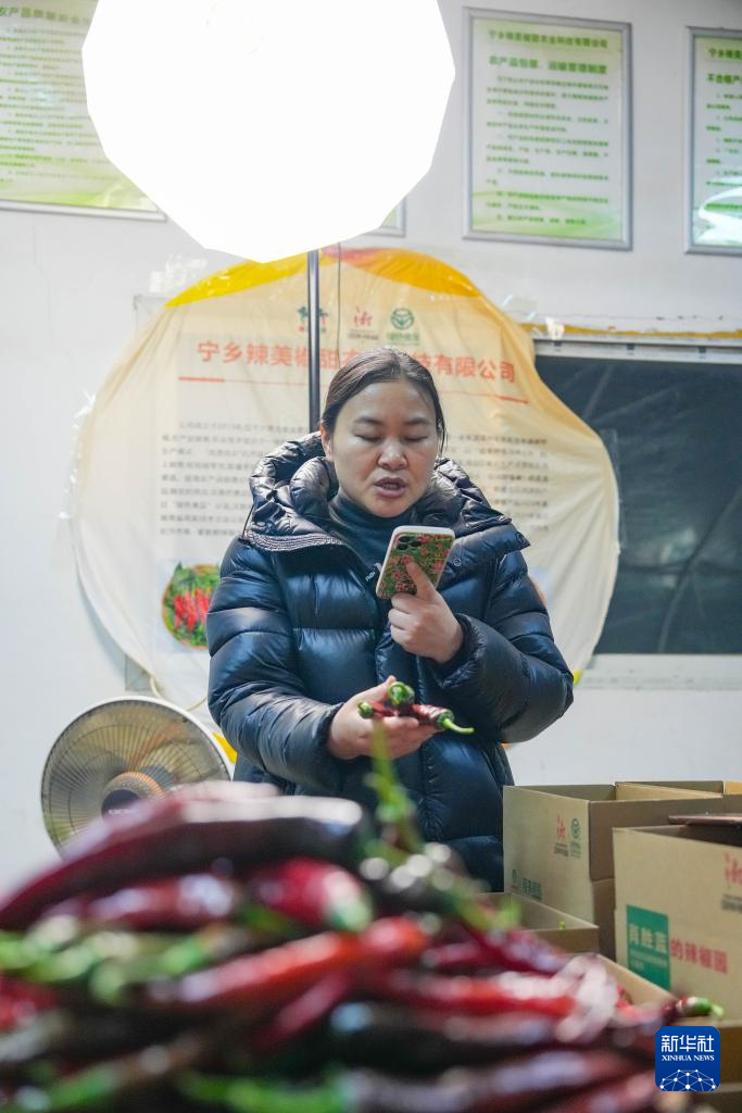 2月6日,贺小贞(左一)在宁乡市肖胜蓝家庭农场直播销售辣椒。