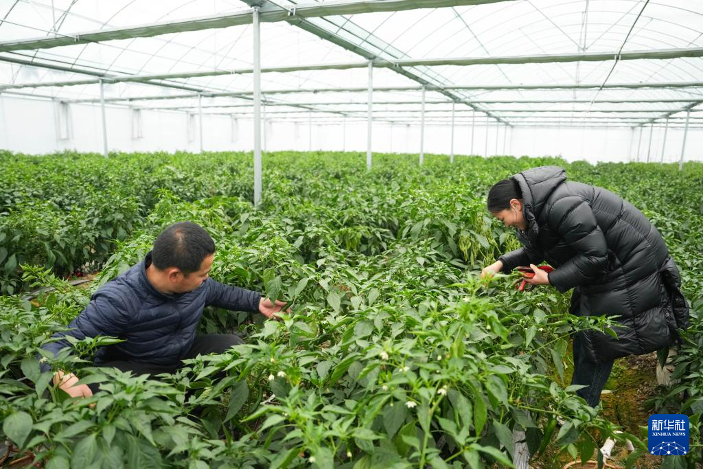 2月6日,肖胜蓝(左)、贺小贞在宁乡市肖胜蓝家庭农场采摘辣椒。