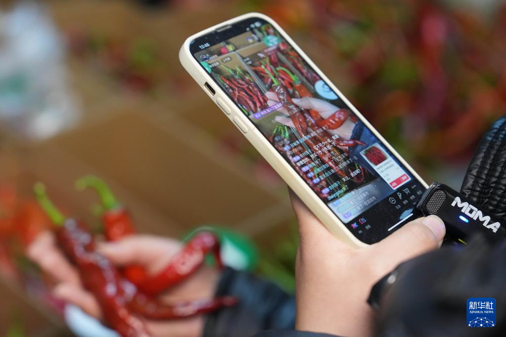 2月6日,贺小贞在宁乡市肖胜蓝家庭农场直播销售辣椒。