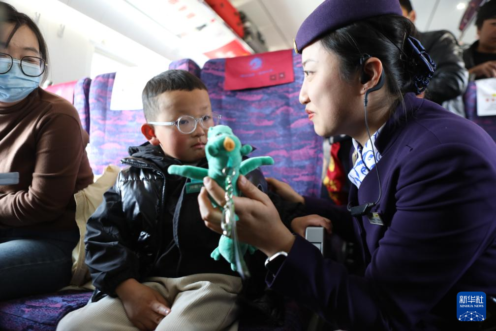 2月7日,兰州客运段高铁乘务人员为外出务工人员的孩子送上文创礼品。
