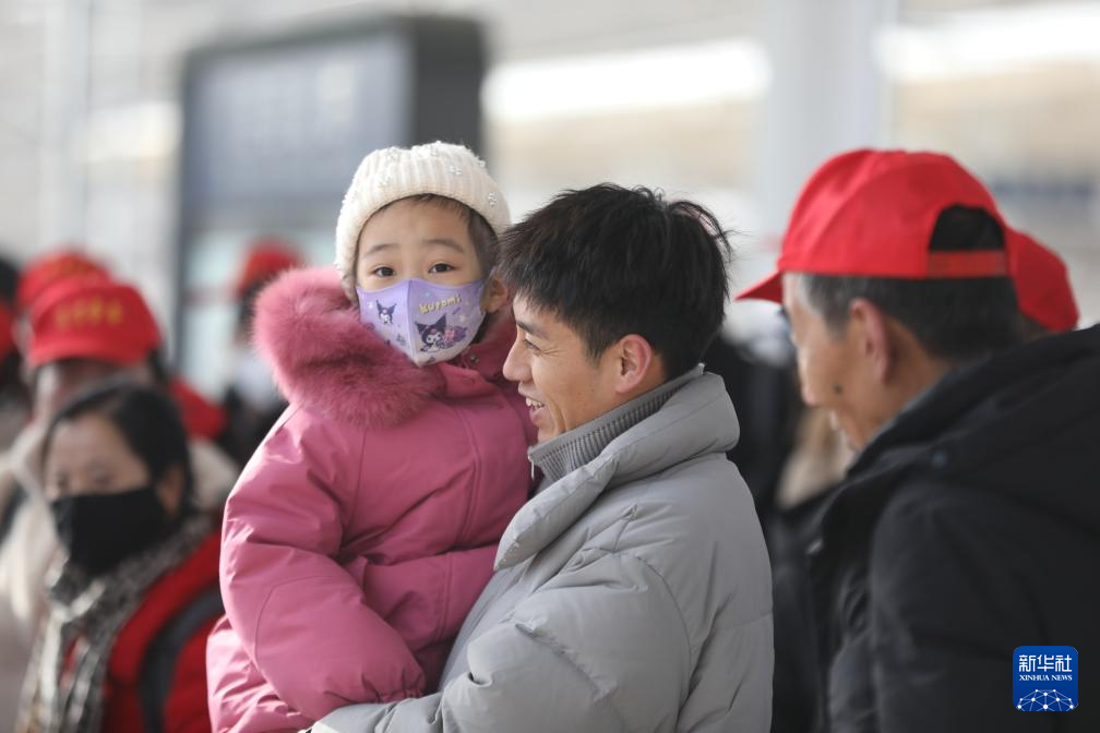 2月7日,甘肃省定西市外出务工人员抱着孩子在站台上等候。