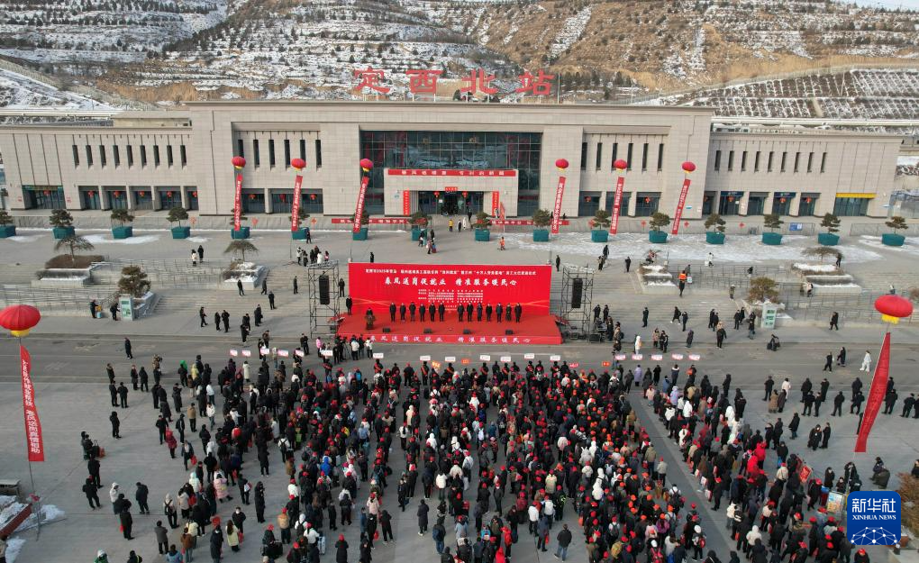 2月7日拍摄的甘肃省定西市返岗务工专列发车仪式现场(无人机照片)。