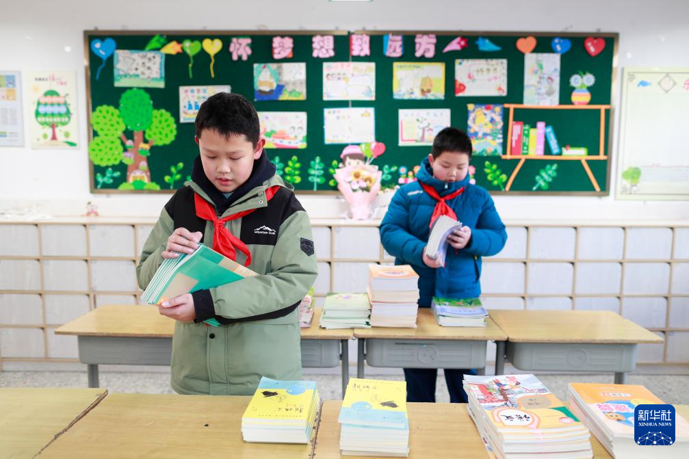 2月8日,江苏省兴化市景范学校的学生在清点、整理新学期教材。