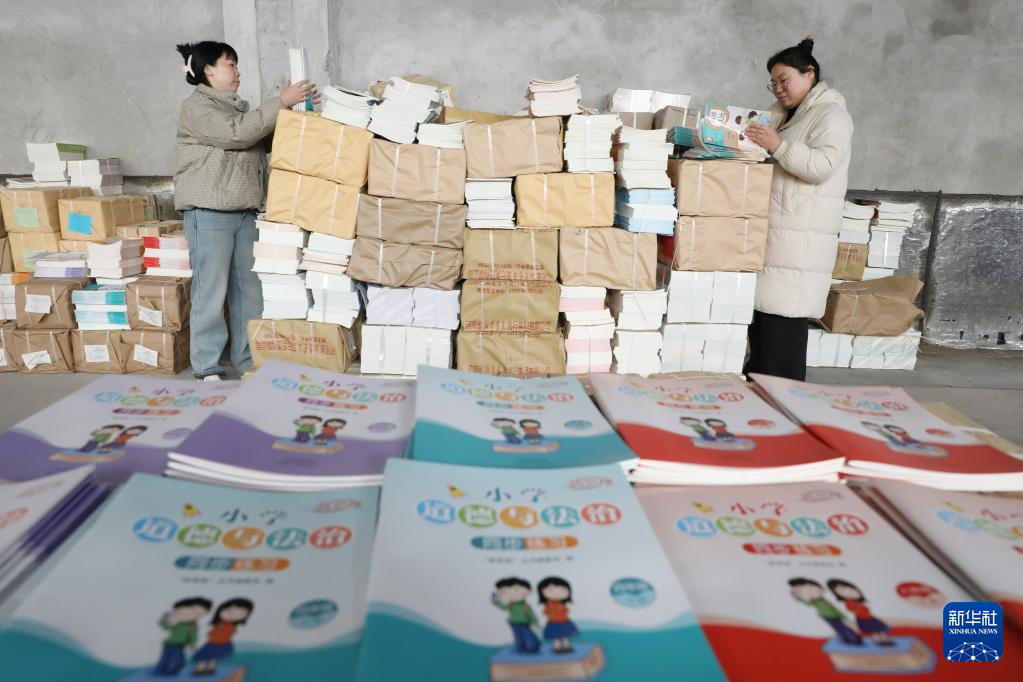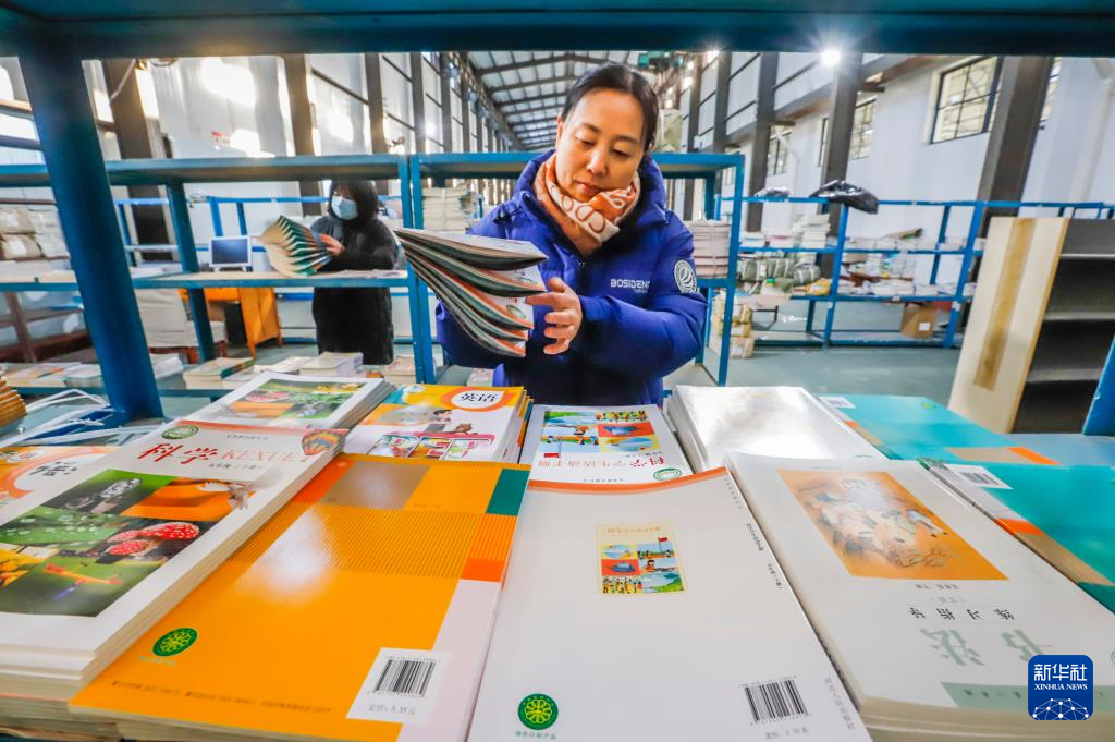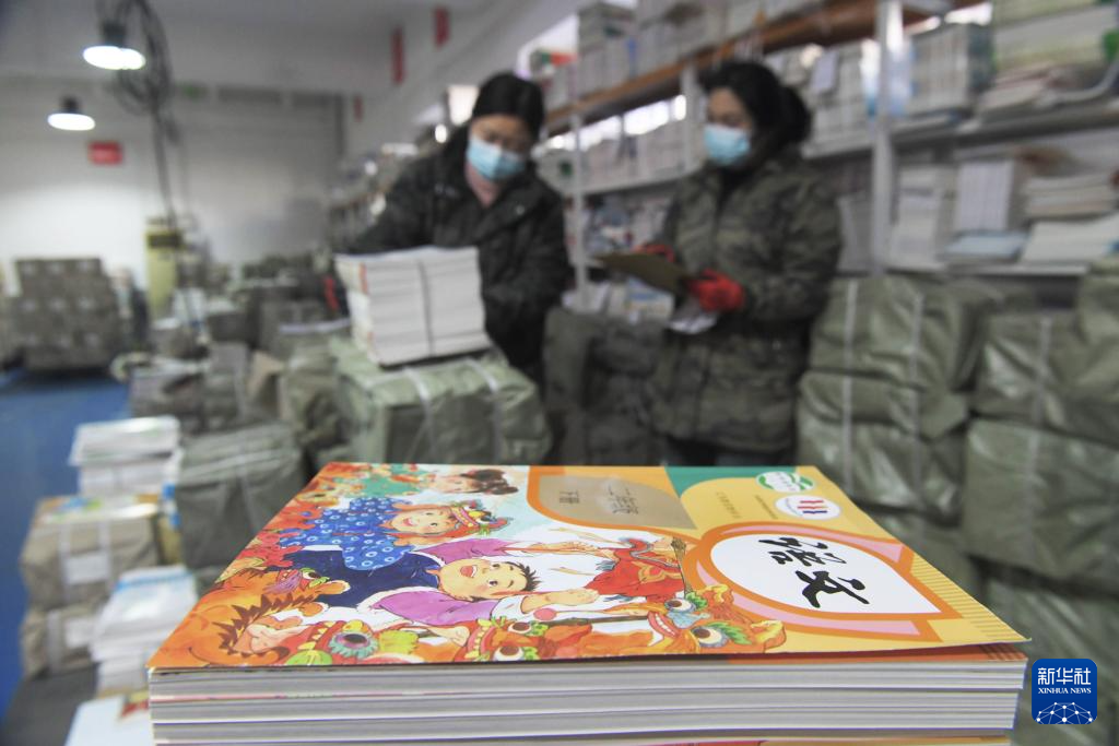 2月8日,工作人员在河北省石家庄新乐市新华书店仓库整理清点中小学教材,准备送往各学校。