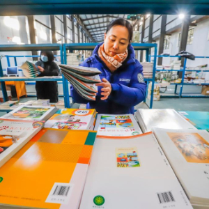 2月7日,在河南省商丘市夏邑县新华书店教材仓库内,工作人员在分拣中小学教材,准备送往各学校。