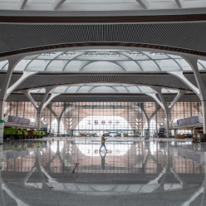 2月8日,工人从重庆东站候车大厅施工现场走过。