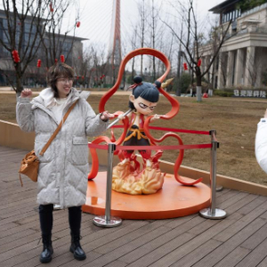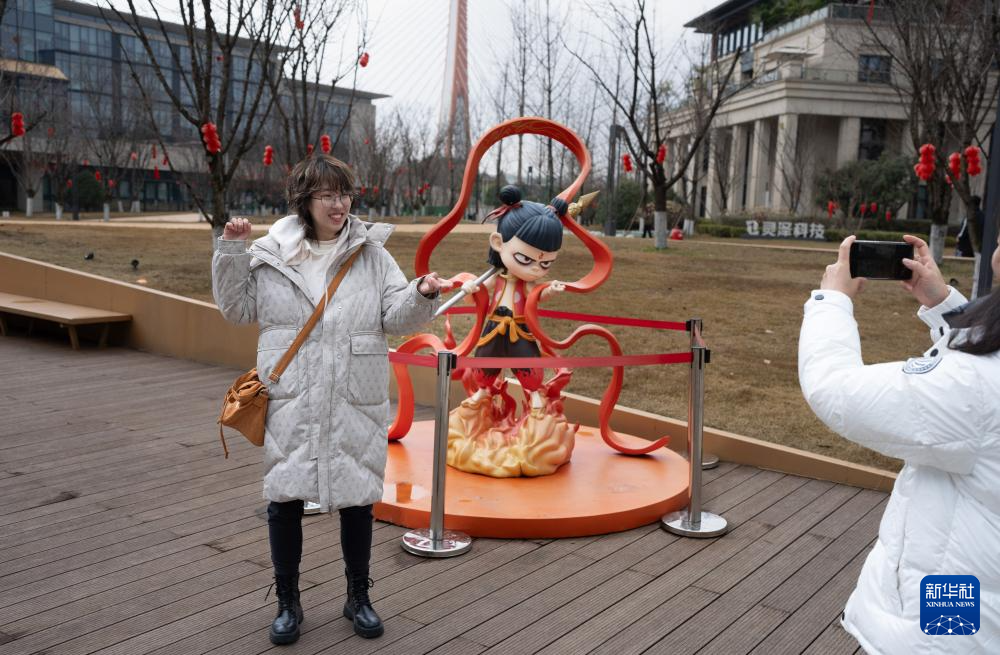 2月8日,影迷在成都天府长岛数字文创园哪吒形象雕塑前合影。