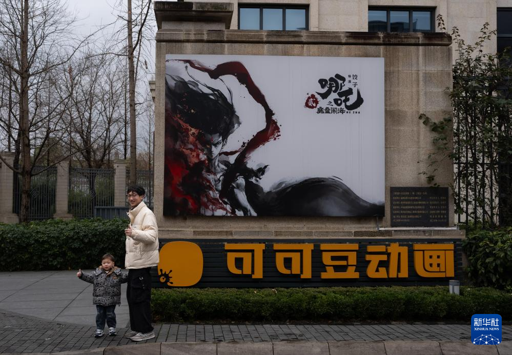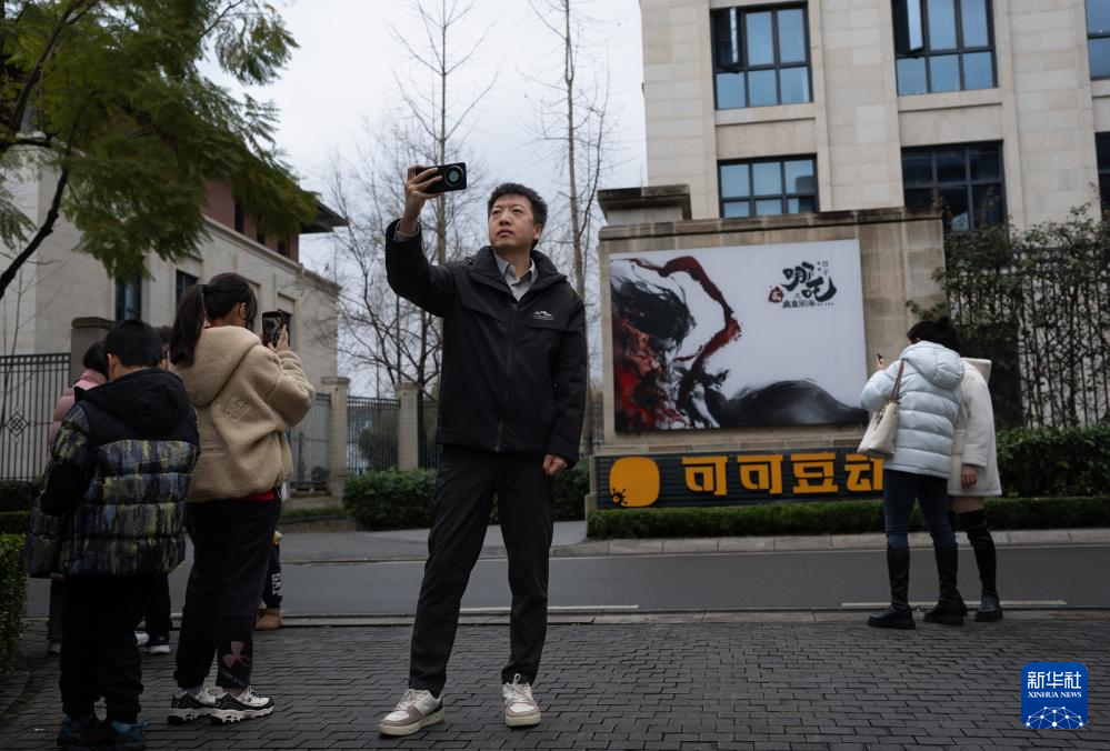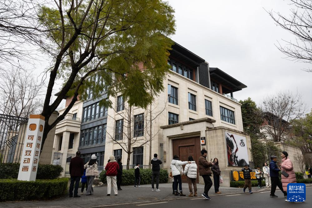 2月8日,影迷们在成都可可豆动画影视有限公司前打卡。《哪吒》系列电影由成都可可豆动画影视有限公司出品制作。