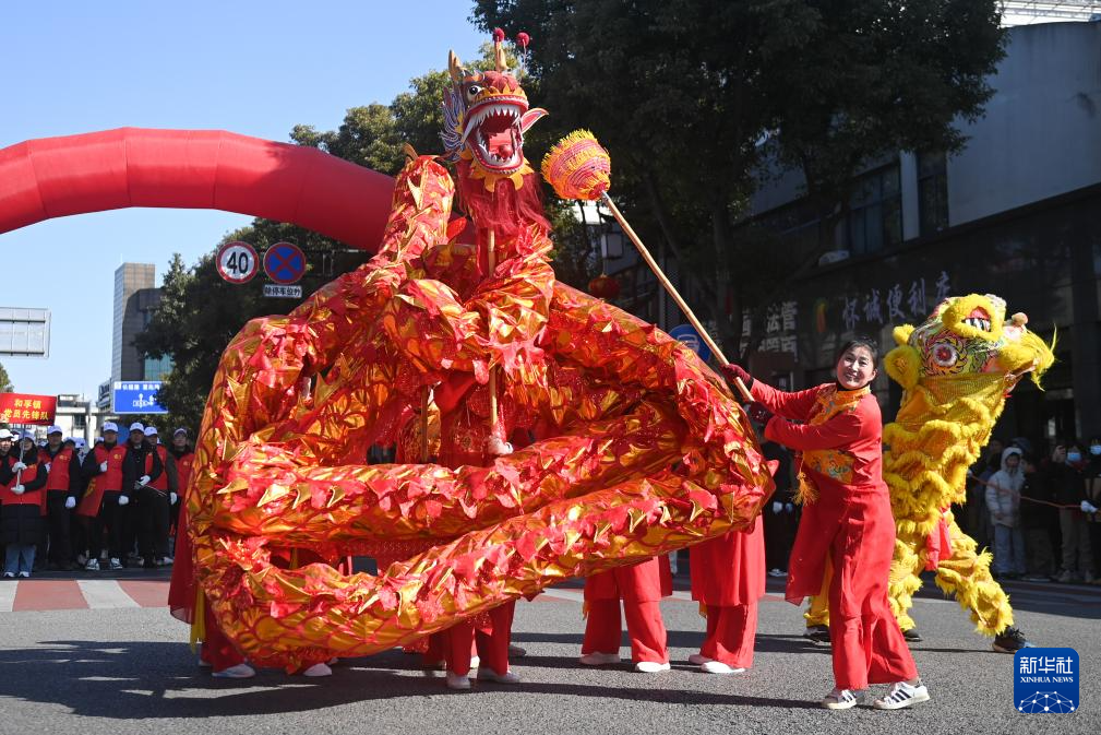 2月8日,舞龙队在南浔区和孚镇街区巡游。