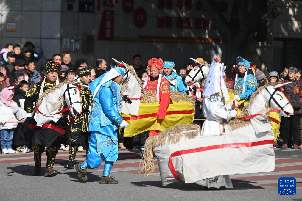 2月8日,乡村马灯队在南浔区和孚镇街区上巡游表演。