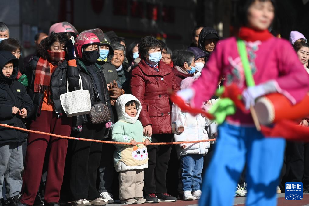 2月8日,观众在南浔区和孚镇街区观看腰鼓队表演。
