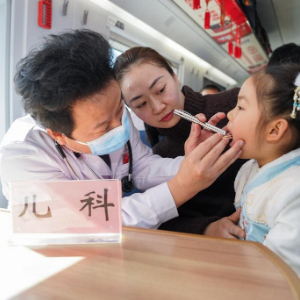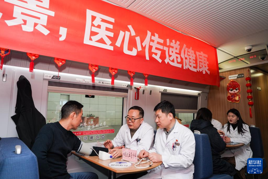 当日,中国铁路上海局集团有限公司合肥客运段在G7776次列车上开展“医心传递健康”义诊活动,来自安徽省第二人民医院的医生为旅客进行免费体检,并进行健康科普教育。