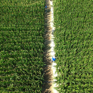 2月10日,在三亚市崖州湾科技城,隆平生物技术(海南)有限公司的科研人员在科研玉米地里工作(无人机照片)。