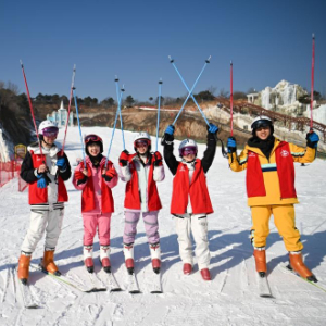 2月10日,参加冰雪体验营的青年在天津市蓟州区的一处滑雪场合影。