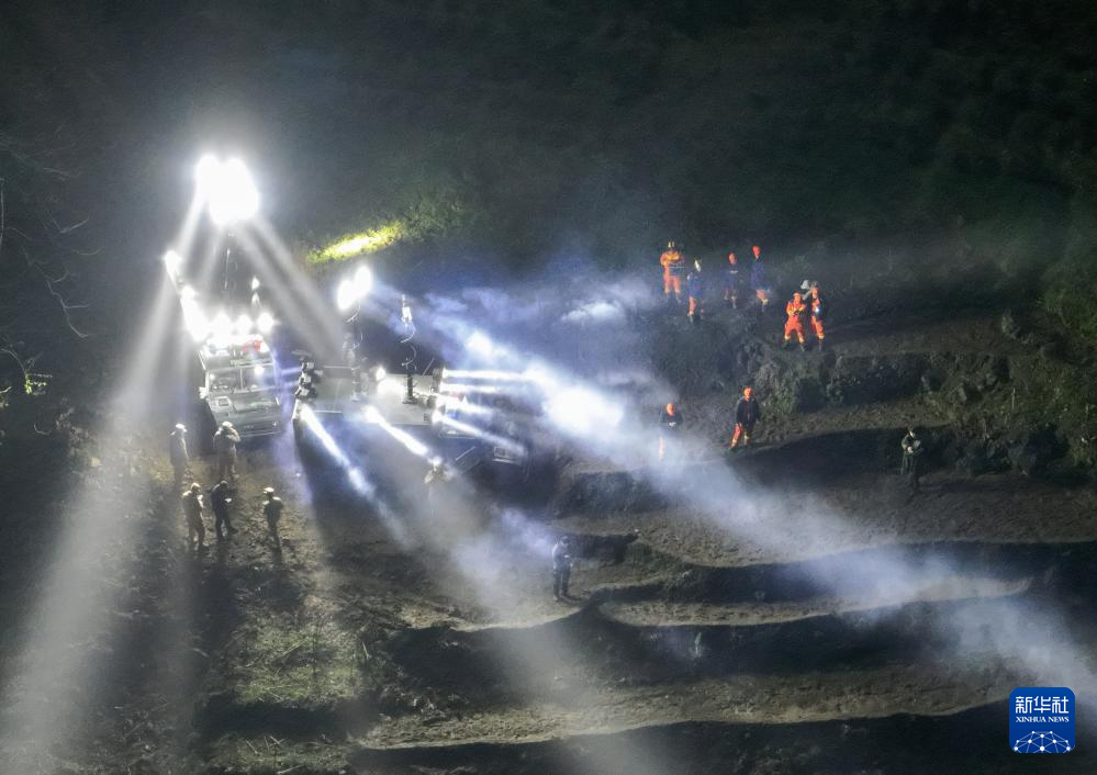 2月9日晚,地上、空中照明照亮了搜救现场(无人机照片)。