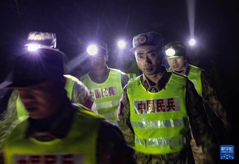 2月9日晚,当地民兵戴着头灯前往搜救现场。