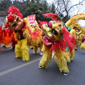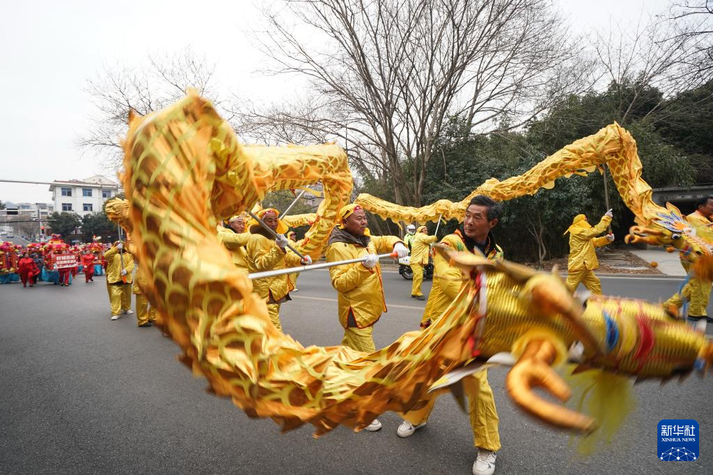 2月11日,舞龙舞狮队在盱眙县城市道路上巡游。