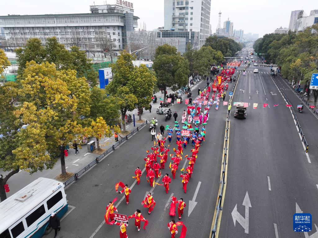 2月11日,展演队伍在盱眙县城市道路上巡游(无人机照片)。