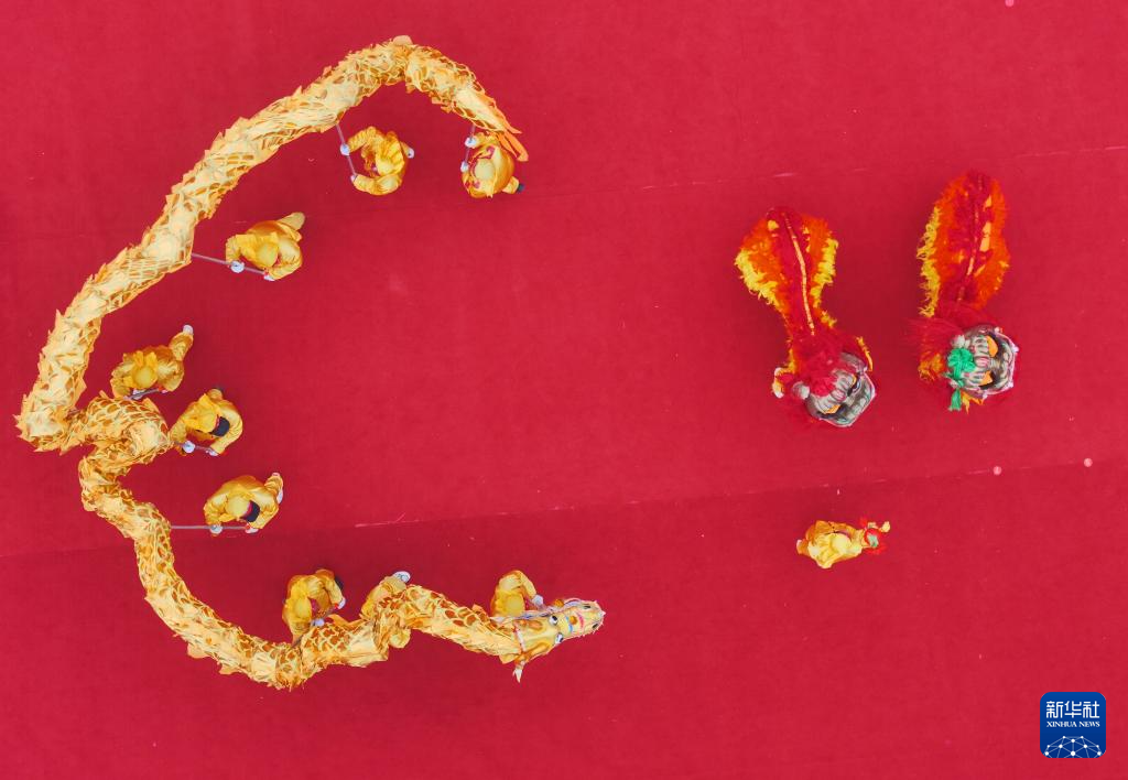 2月11日,群众在盱眙县第十届元宵节民俗汇演活动上舞龙舞狮(无人机照片)。