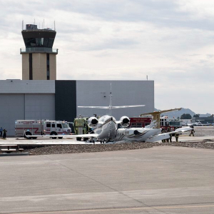 这张拍摄于2月10日的社交媒体照片显示,消防员在美国亚利桑那州斯科茨代尔机场的飞机相撞现场工作。