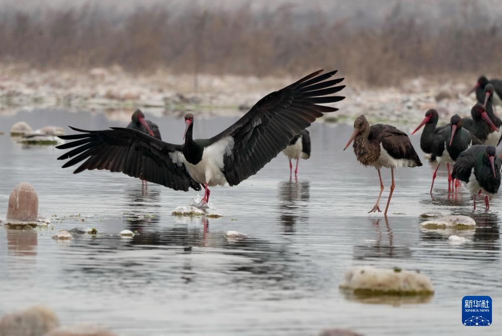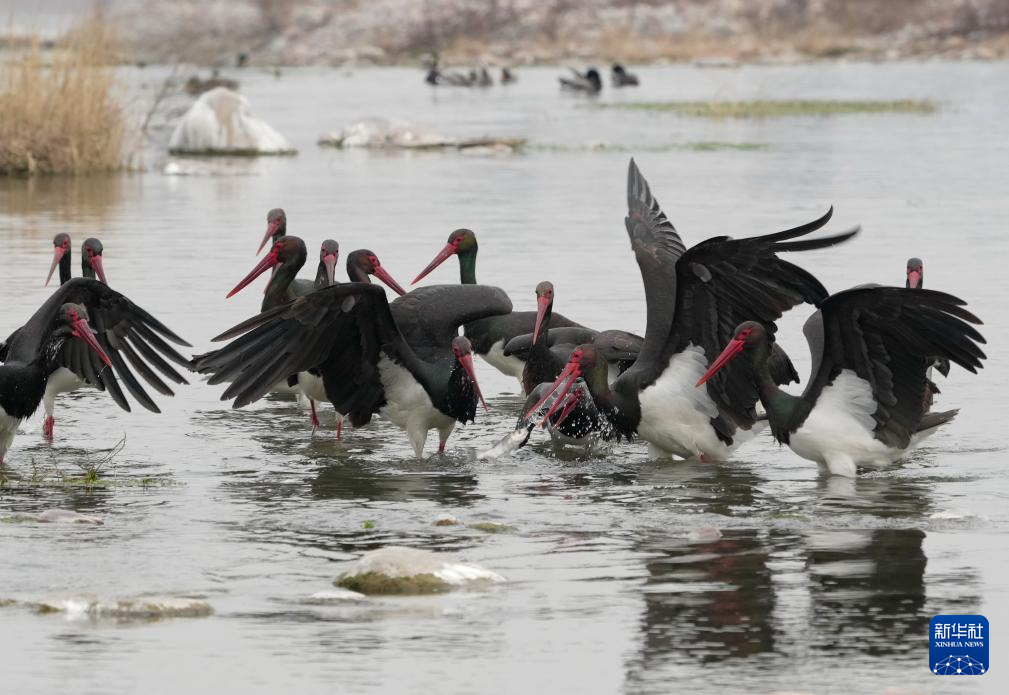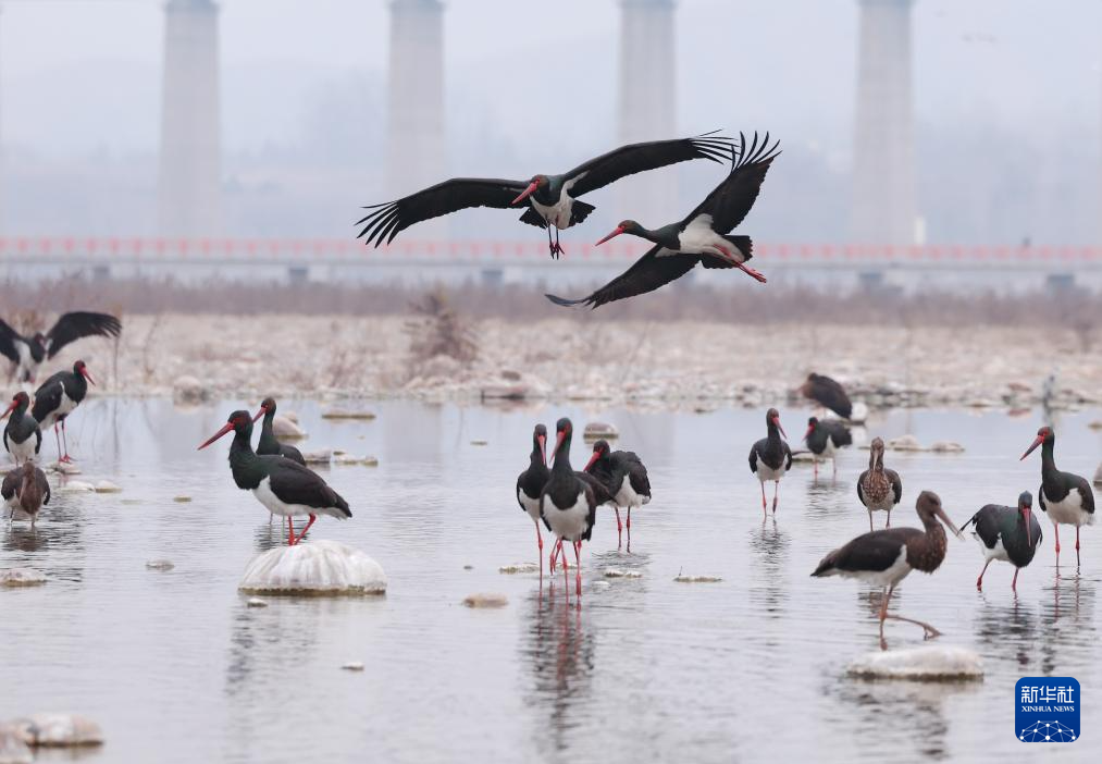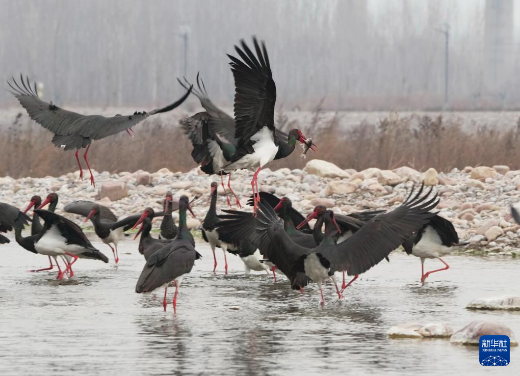 2月11日,一群黑鹳在河北省井陉县境内的绵蔓河内觅食。