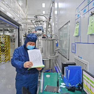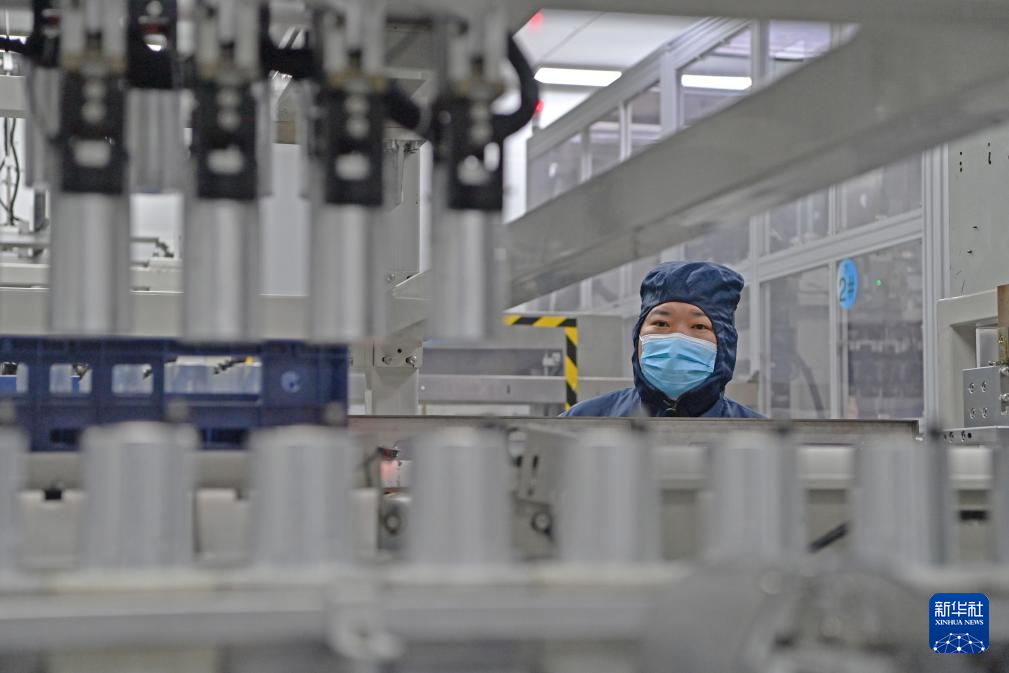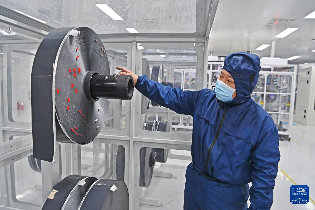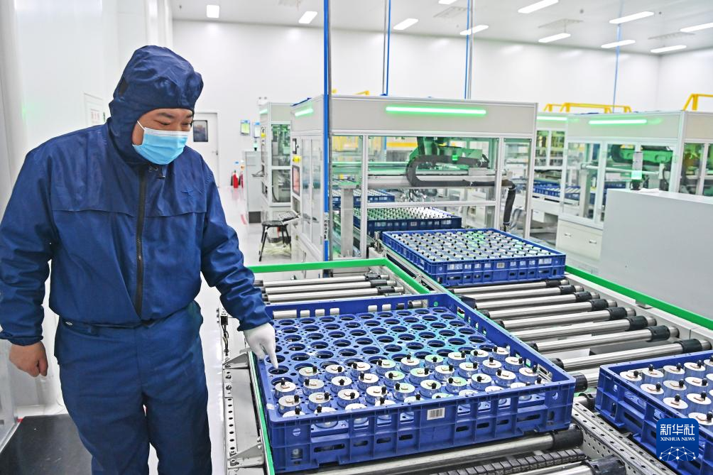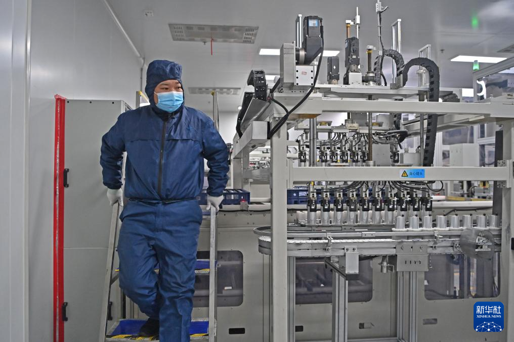 王东林在查看电池注液情况(2月9日摄)。