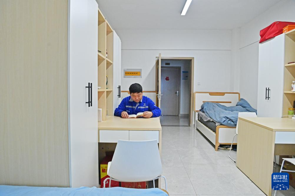 王东林在员工宿舍看书(2月9日摄)。