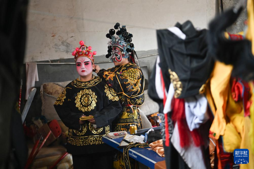 2月9日,陇县流渠村社火队的孩子为同伴整理演出服装。