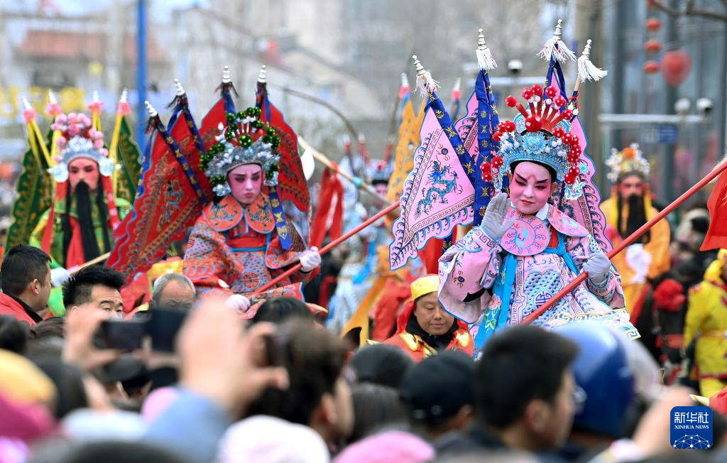 2月12日,步社火演员在陇县元宵节社火巡游活动上表演。