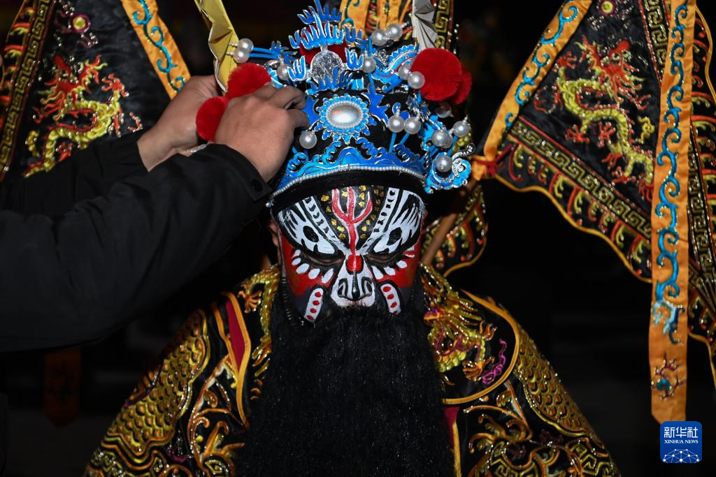 2月11日,在陇县黄花峪村,一名村民为马社火演员穿戴演出服饰。