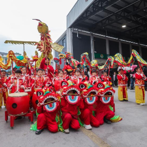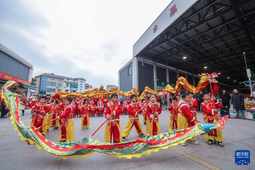2月12日,在建德市更楼街道的建德新农都农产品批发市场元宵市集上,小朋友表演“萌娃舞龙”。