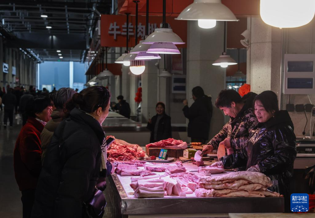 2月12日,消费者在建德市更楼街道的建德新农都农产品批发市场内选购肉类食品。