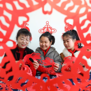 2月13日,在河北省唐山市丰润区火石营镇黄昏峪小学举行的“非遗进校园”开学第一课主题活动中,剪纸艺人葛英(左一)向学生传授剪纸技艺。