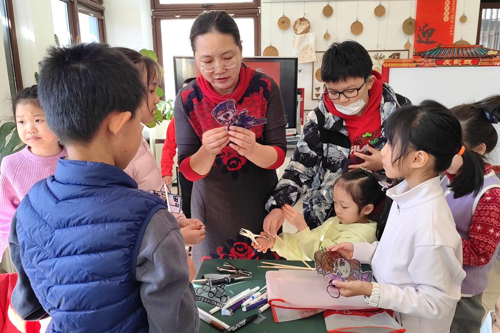 2月12日,老师在为小朋友讲解皮影戏的有关知识。