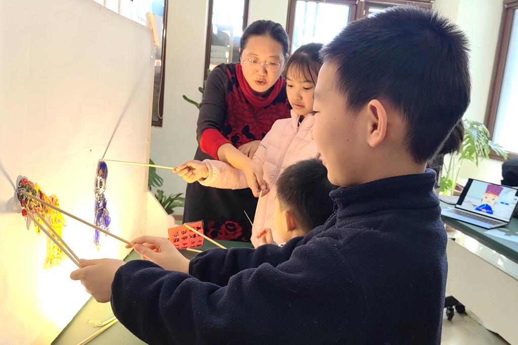 2月12日,老师在指导小朋友皮影戏表演的有关技巧。新华网记者 王佳宁 摄
