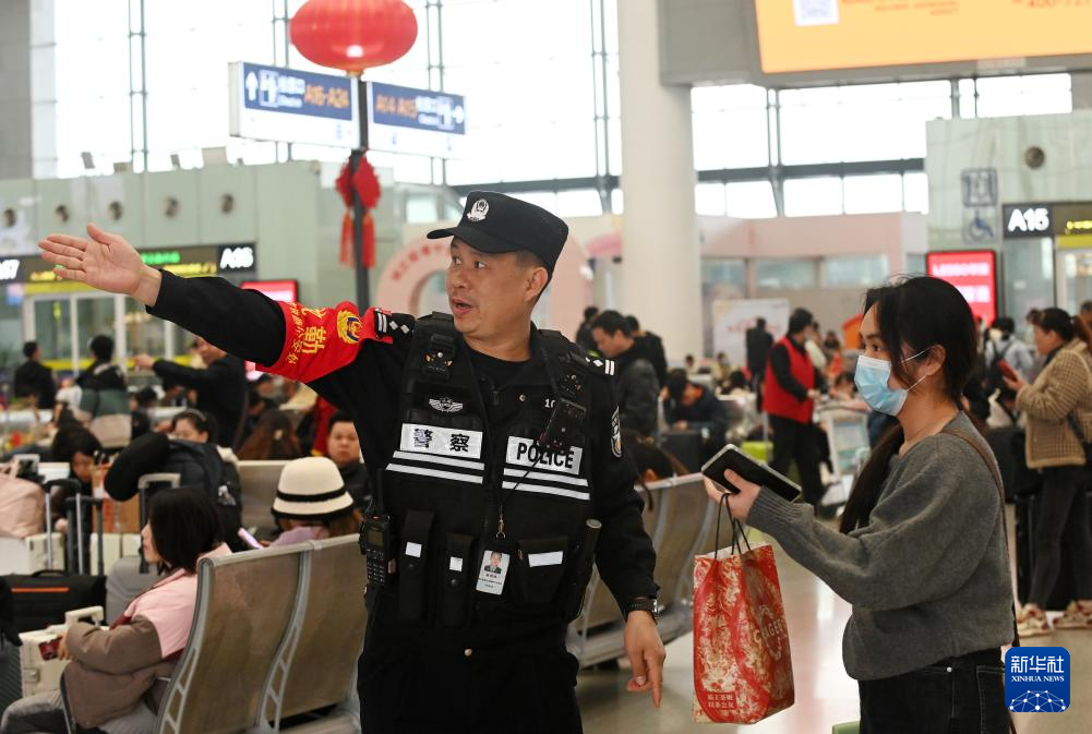 2月14日,在南宁东站,南宁东站派出所民警高明伟解答旅客咨询。