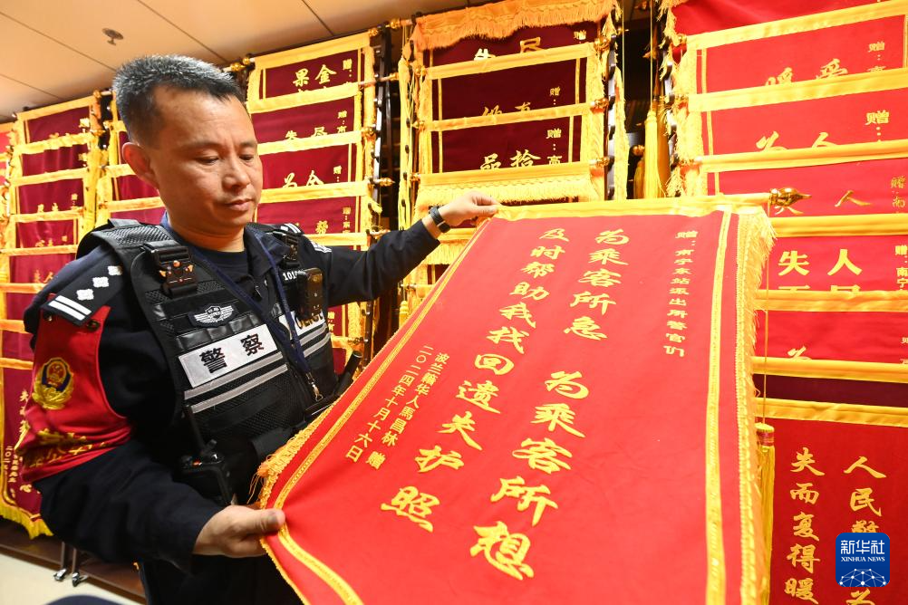 2月14日,在南宁铁路公安局南宁公安处南宁东站派出所,民警高明伟展示一面波兰籍华人旅客送来的锦旗。