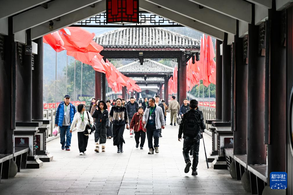 2月13日,游客在重庆奉节白帝城风雨廊桥游览(无人机照片)。