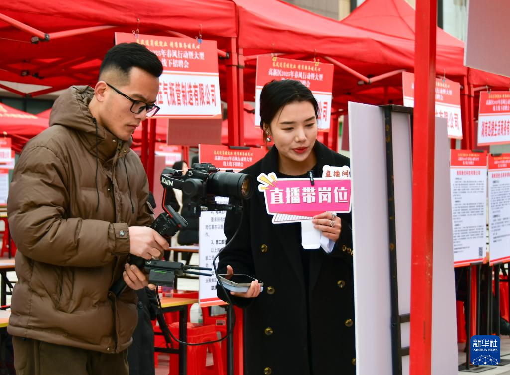 2月10日,工作人员在湖南省衡阳市高新区举办的2025年“春风行动”招聘会上现场直播。