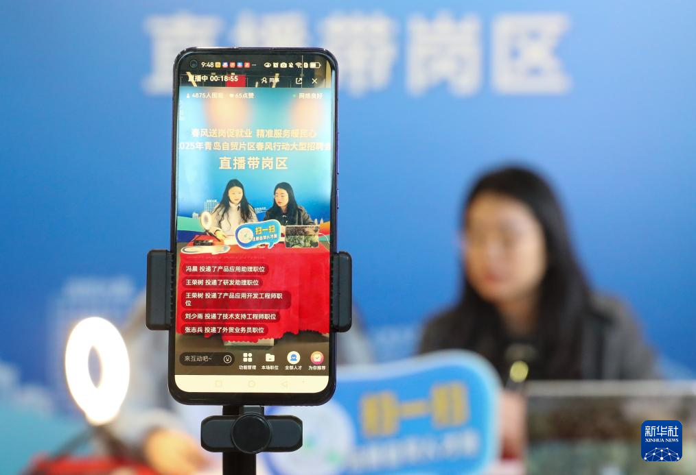 2月14日,工作人员在山东青岛自贸片区 “春风行动”专场招聘会现场进行直播带岗。