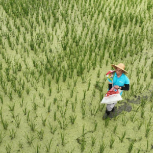2月14日,在海南三亚的国家南繁科研育种基地里,青岛海水稻研究发展中心的科研人员张书艮对水稻进行施肥(无人机照片)。