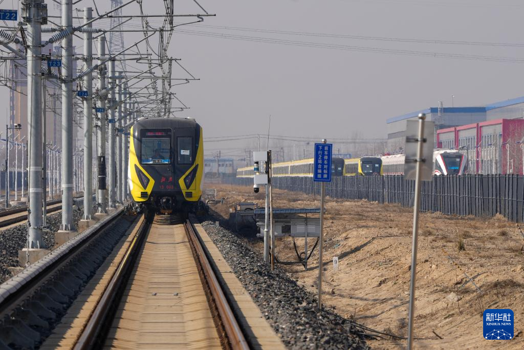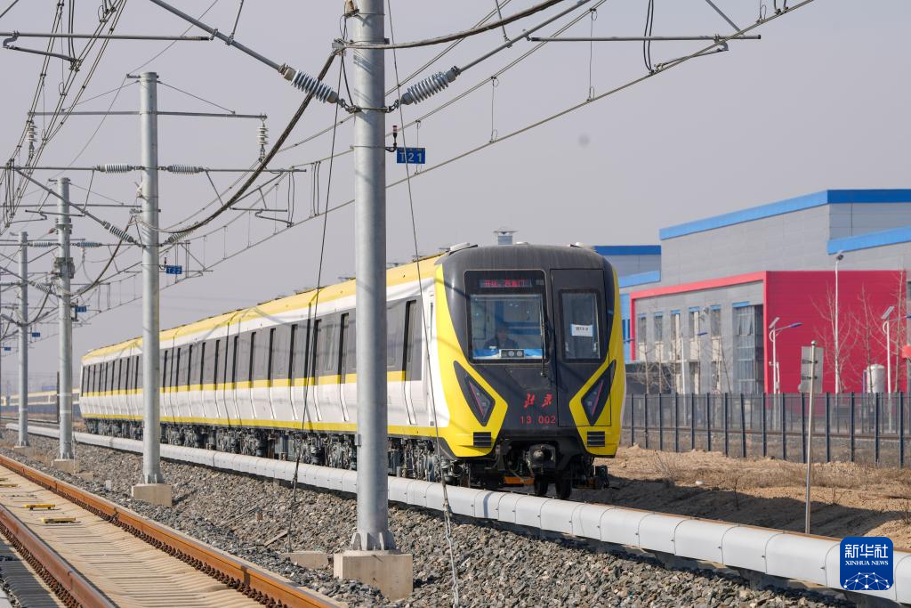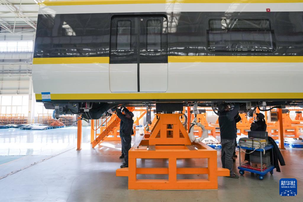 在京投装备河北京车智能制造基地内,工作人员在进行北京地铁13号线新款地铁列车的调试工作(2月14日摄)。