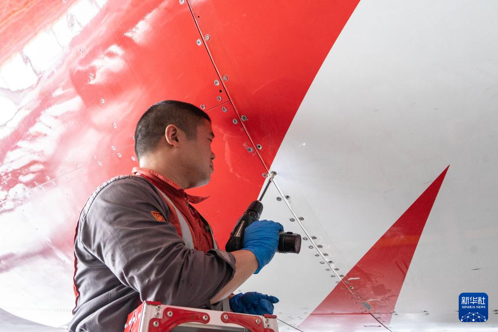 2月17日,在海南自贸港一站式飞机维修产业基地,海航技术旗下大新华飞机维修服务有限公司工作人员对进境飞机进行检修。